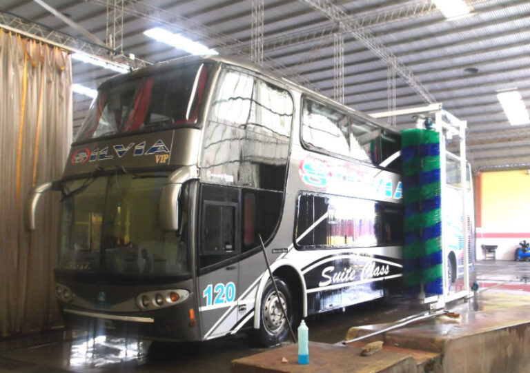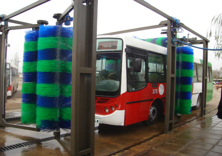 Para lavado de ómnibus. Equipo en desarrollo longitudinal con cuatro cepillos laterales autorregulables y un lavatechos (Opcional)